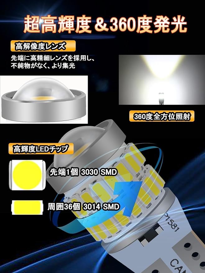 【高輝度チップ搭載&高集光レンズ】高発光効率の3014 LED素子 36個搭載、360 全方位照射できます。T10 LEDバルブで 均一発光させるガラスレンズ付き、トップに搭載したLED素子の明るさをもっと広く、遠く発散可能、明るさはハロゲンより大幅にアップ!最適な拡散と圧倒的な明るさを実現!