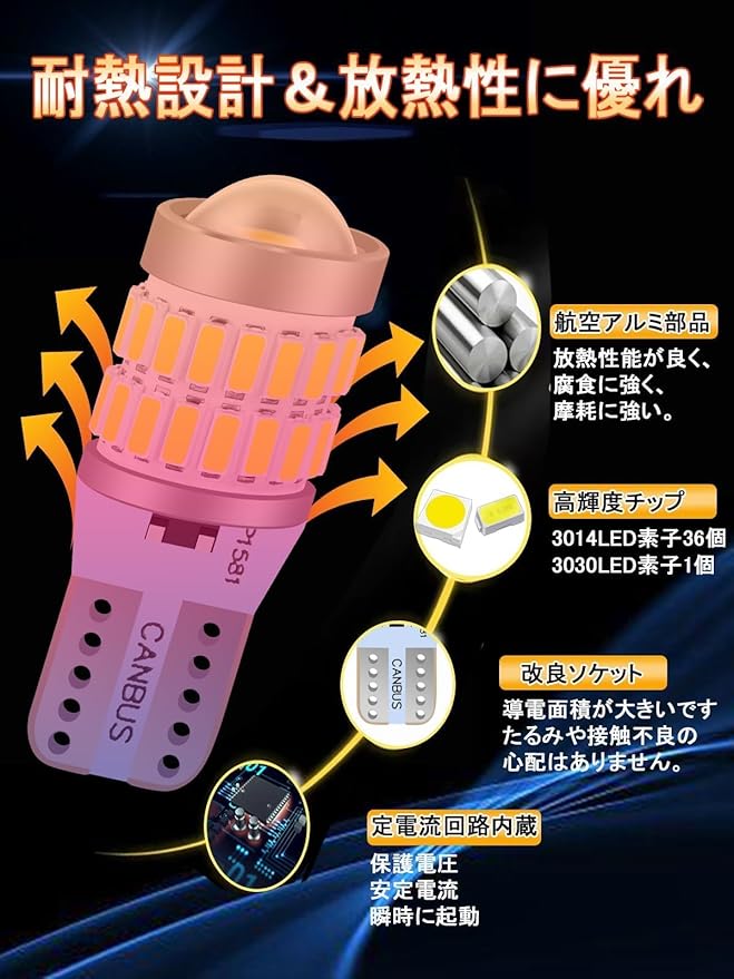 【抜群の明るさ&安定した性能】純正ハロゲンに比べ360度全方位へ光をムラなく照射し視認性が抜群です。T10 LED ホワイトで他の製品と比較しても、明るさが際立っています。定電流保護回路を搭載し、動作電圧の範囲で安定した点灯が可能で、LEDチップの寿命を保護する。長時間使用してもチップの発光効率は低下しません。