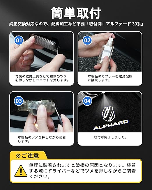 4.【簡単取付】専用設計なので、取付箇所の加工は一切不要で、内張剥がしやドライバーなどで純正カーテシライトを取り外し、カプラーオンで簡単に取り替えます。ご愛車を損なうことなく、素人でもラクラク。