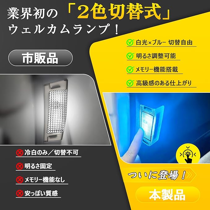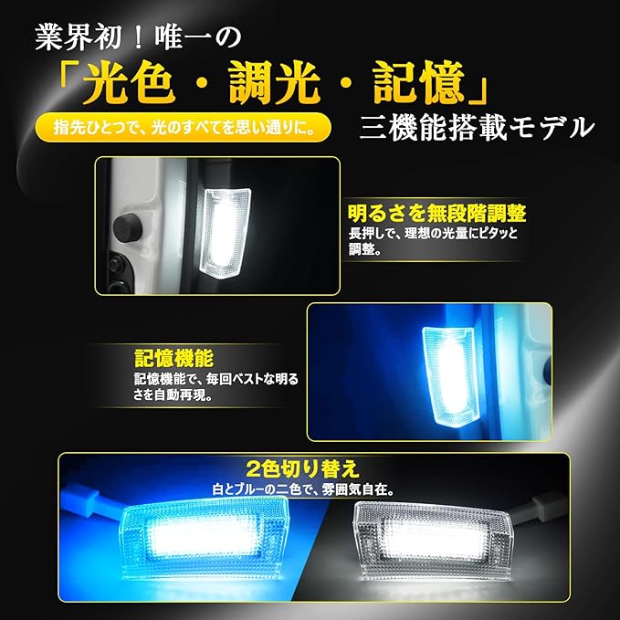 【2色切替 調光 記憶機能|すべてが揃った1台】ホワイトとアイスブルーの2色をシーンや気分で切替え可能。長押しでお好みの明るさに無段階調整、さらに次回も同じ設定で点灯する記憶機能付き。これ1つで、演出・視認性・快適さの全てを両立。今までにない自由な灯りで、愛車の質感をさらに引き上げます。