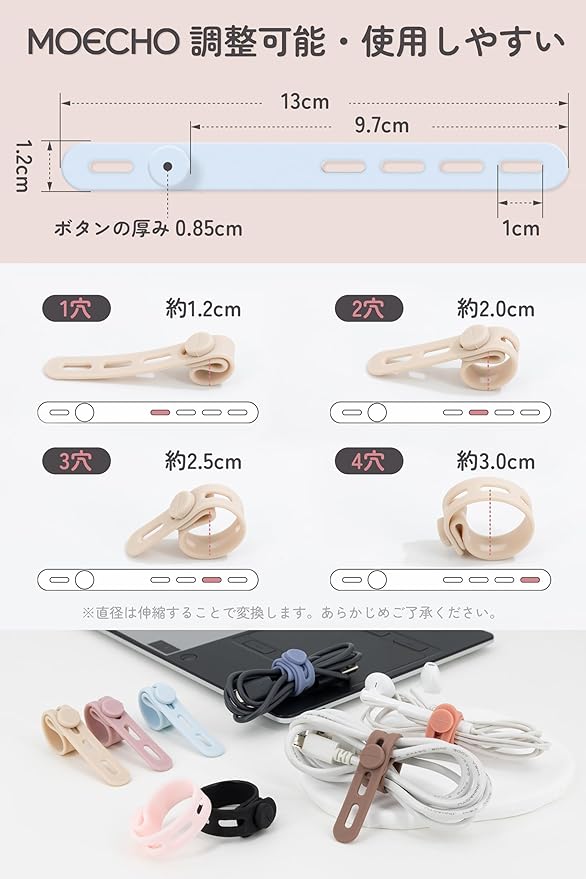 【4穴調整・束ねやすい】ケーブルクリップは4穴のデザインを採用し、穴径を調整することで、 太いコードも細いコードもしっかりと固定できます