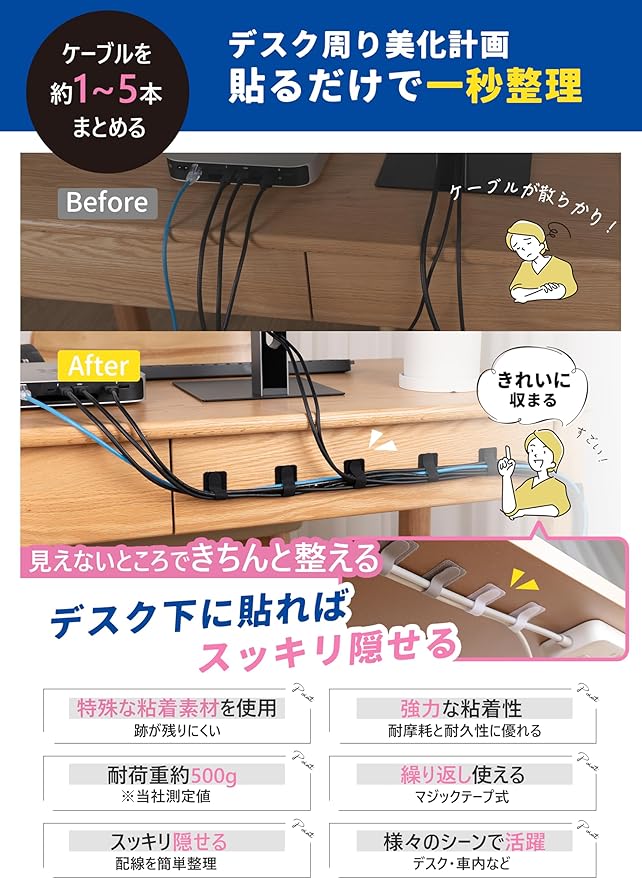 【超強力粘着力・のり残らず】製品の裏面には高性能の粘着剤を採用しており、机の裏や壁面にもぴたっと貼り付きます。穴を開ける必要がなく、使用後にはがしても跡が残りにくいため、賃貸でも気軽にお使いいただけます