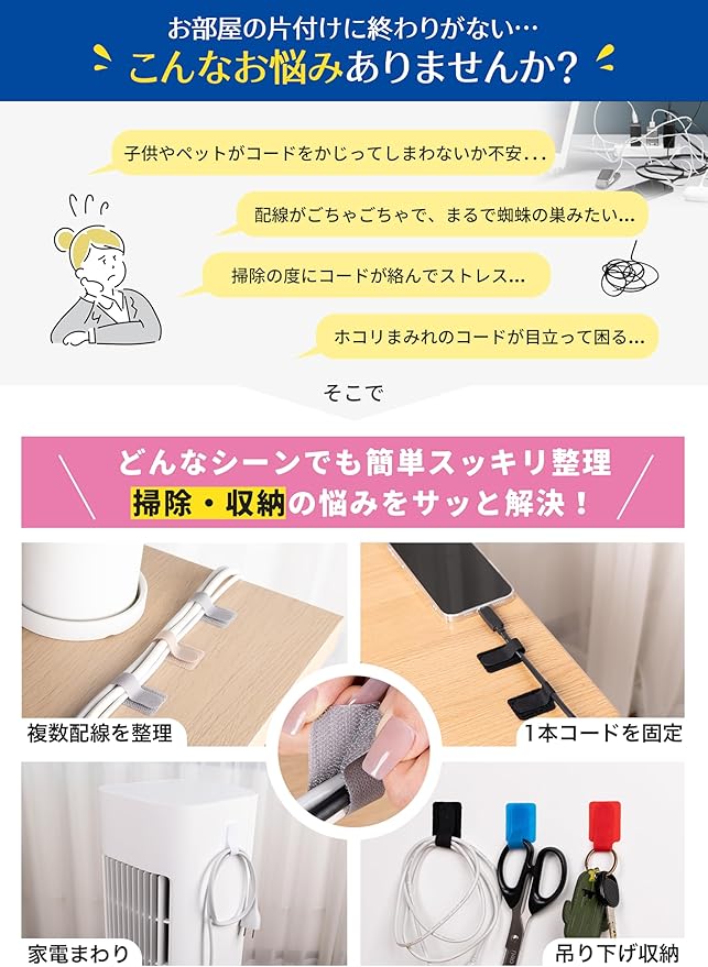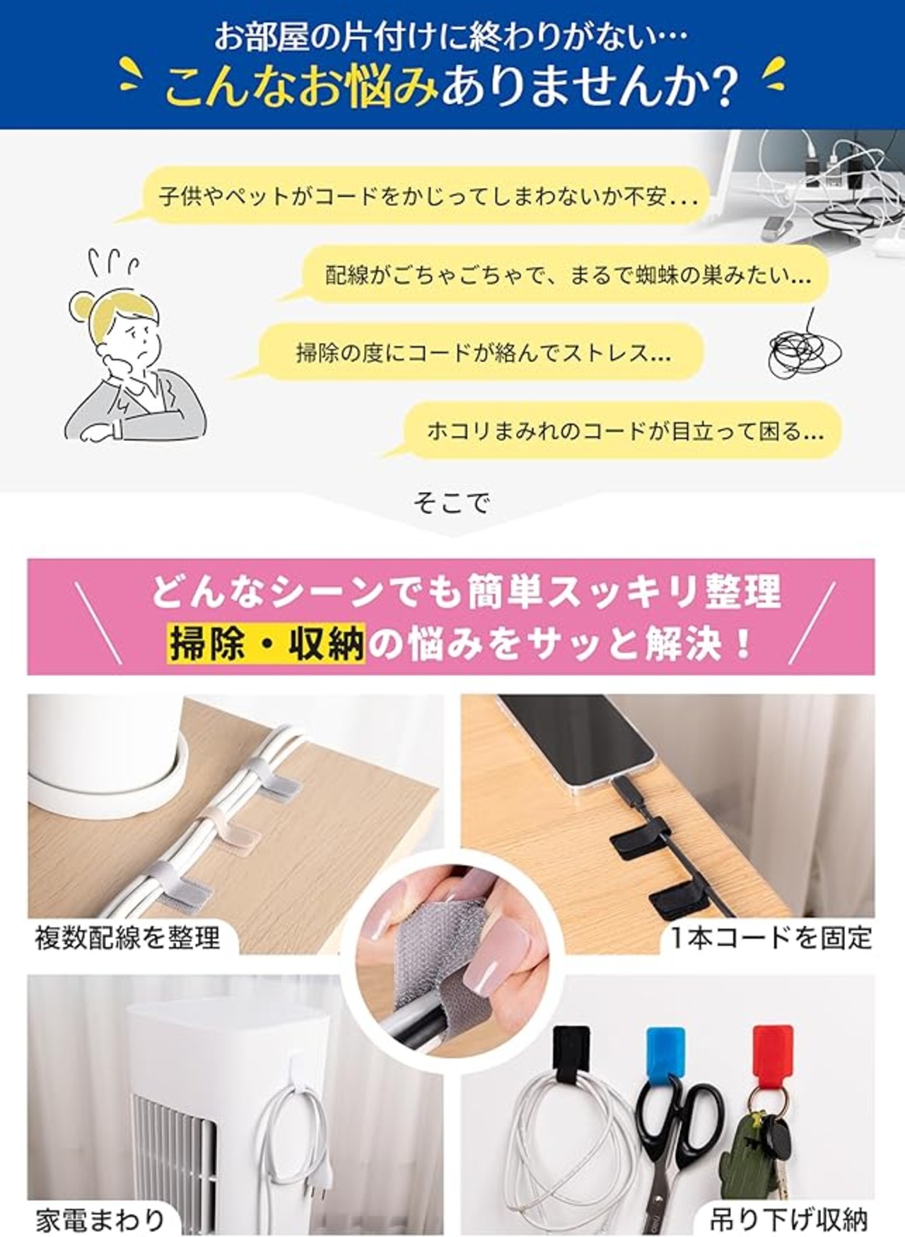 コード まとめる 【7色展開・2サイズ・跡残らず】 配線止め ケーブルクリップ コードクリップ ケーブルバンド マジックテープ 結束バンド ケーブル コード 壁に這わせる 固定 整理 デスク 車内 家電周り スッキリ lanケーブル 電源コード 配線 収納 家庭 オフィス 適用 | etshop