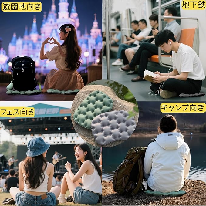 【数秒で空気抜き&滑り止め加工】 専用バルブを開けばあっという間に空気が抜け、折りたたみ座布団としてすぐに小さく収納可能。レジャーシート コンパクトやレジャーシート 1人用と組み合わせれば、一人分のスペースを素早く快適にアレンジできます。片面に滑り止め加工が施され、飛行機や夜行バスなどのツルツルした座面でも滑らず安定します。