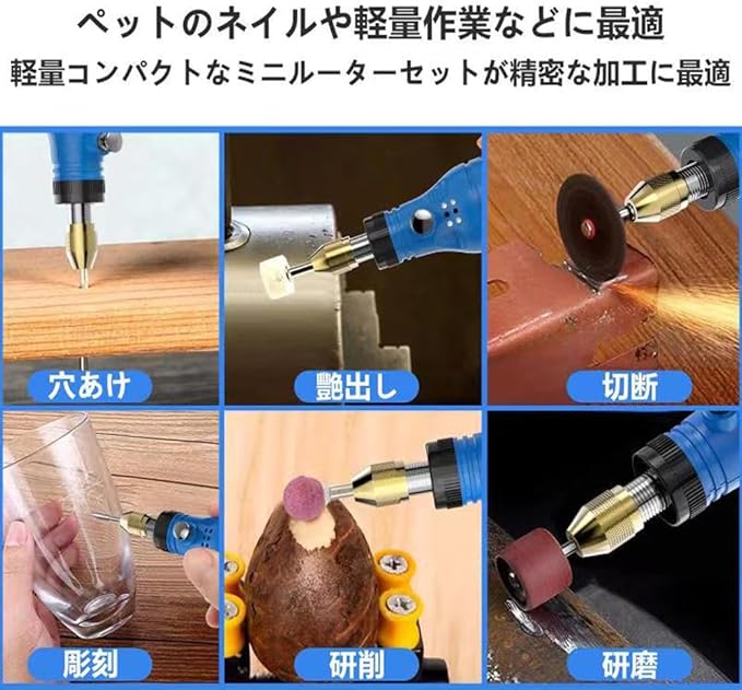 【TYPE-C充電式・コードレス】リューター充電式のモデルはミニルーターコードレス式で強力なパワーがあります、DIYやホームリフォームの作業に最適です。リチウム電池を採用して、TYPE-C充電式で接続して充電できます。無負荷で1.5時間くらい作業し続けられます。 ガラス彫刻や金属研磨・穴あけ・つや出し・模型工作などに対応できる、DIYや趣味など幅広い場所で使い勝手よく楽々。
