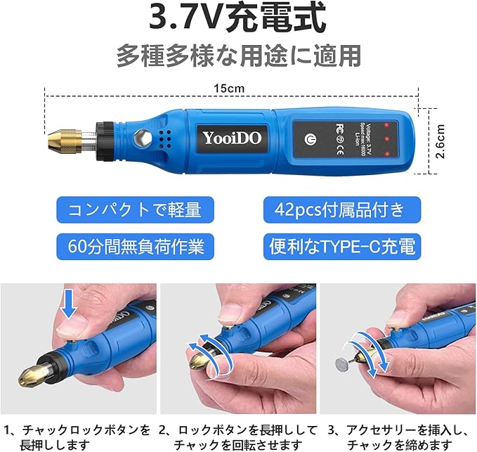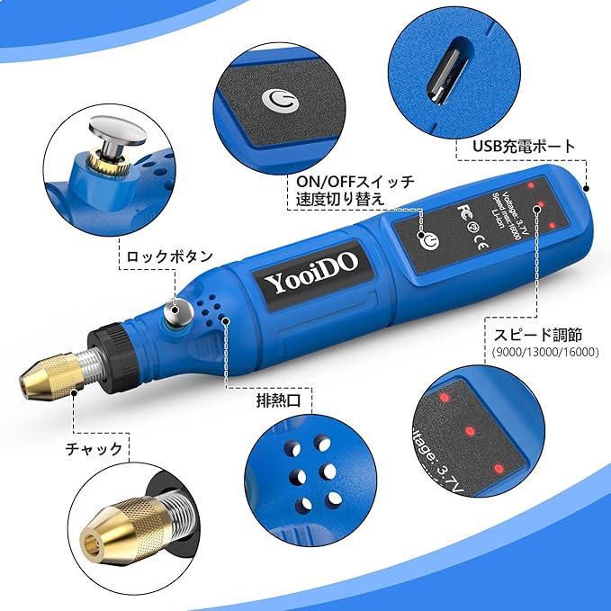 YooiDO ミニルーター リューター 3.7V 無線ルーター 3段変速 最大16000RPM/Min 42pcsワイヤレスリューター ルーター工具TYPE-C充電式 研磨/彫刻/切削/穴あけ/汚れ落とし/錆落とし/切断/つや出し/ネイルアート DIY軽作業 ミニ工具セット 電動ルーター 充電式りゅーたー (ブルー) | etshop