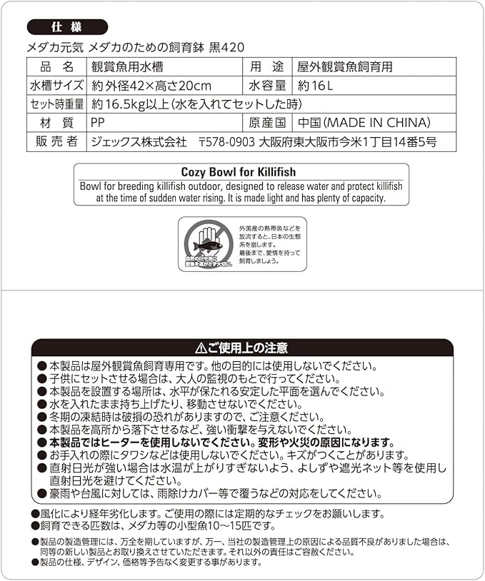 鳥獣被害の恐れがある場合は、別売の「メダカ元気 メダカのための飼育鉢用フタ大 半円」をご使用ください。 ●水位は、水抜け穴より約2cm下を目安に入れてください。 飼育できる匹数は、メダカ等の小型魚10-15匹です。