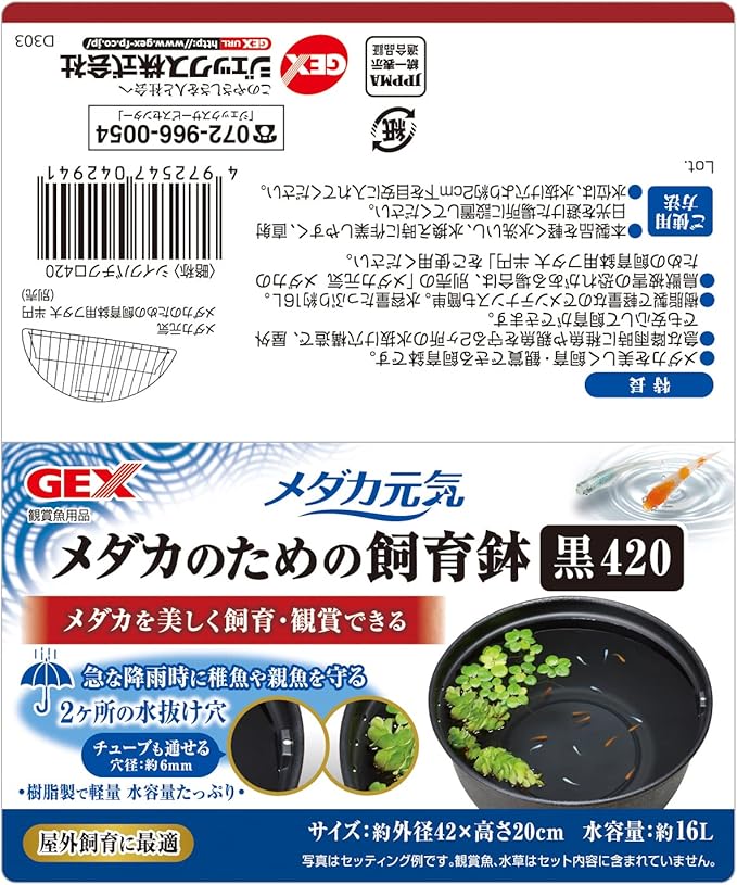 メダカを美しく飼育・観賞できるメダカのための飼育鉢。急な降雨時に稚魚や親魚を守る!2ヶ所の水抜け穴。チューブも通せる(穴径:約6mm) 屋外飼育に最適! 急な降雨時に稚魚や親魚を守る2ヶ所の水抜け穴構造で、屋外でも安心して飼育できます。 樹脂製で軽量なのでメンテナンスも簡単。水容量たっぷり約16L。 鳥獣被害の恐れがある場合は、別売の「メダカ元気 メダカのための飼育鉢用フタ大 半円」をご使用ください。 ●水位は、水抜け穴より約2cm下を目安に入れてください。 飼育できる匹数は、メダカ等の小型魚10-15匹です。 ●水槽サイズ:約外径42.0 高さ20.0cm ●水容量:約16L ●材質:PP