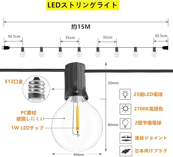 【商品仕様】コード長:約15m ソケット間隔:約55cm 防水仕様:IP44 電球消費電力:1W 色温度:2700K電球色 ビーム角:360 電源:AC110V 50/60Hz ソケット個数:25個 重量:約1.8kg 使用温度:-20℃~40℃