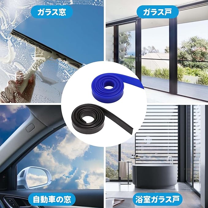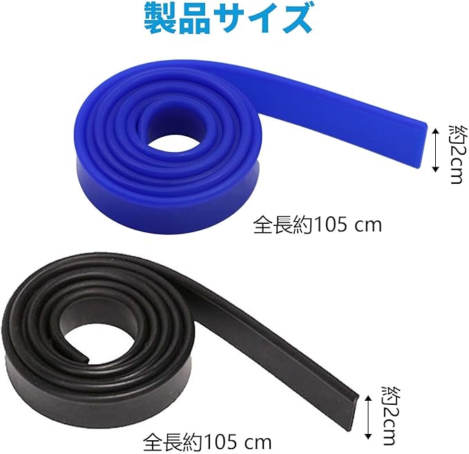 【包装】異なる色(青*1+黒*1)のガラスワイパーゴムストリップを2本お届けします。サイズ仕様は約105*2.1cmです。長さ105cmはプロの清掃業者や毎日の家庭での使用に十分で、スキージのサイズに応じてカットすることもできます。