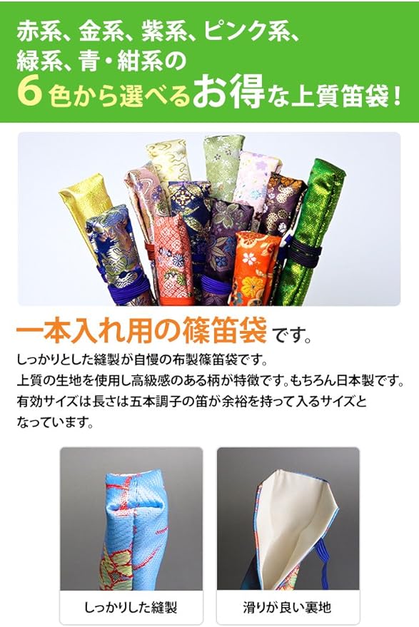 一本入れ用の篠笛(横笛)袋です。しっかりとした縫製が自慢の布製篠笛袋です。 上質の生地を使用し高級感のある柄が特徴です。もちろん日本製です。