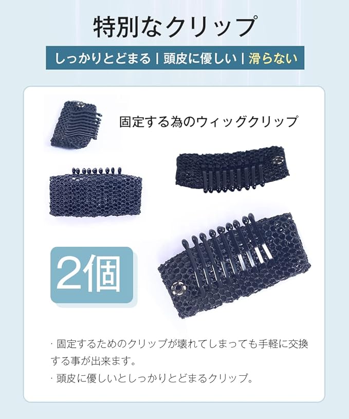 頭皮に優しい:クリップによる付け外しの痛みがすくない、頭皮に触れる面積を広くしたことで、摩擦が増え強固な固定を可能にしました。