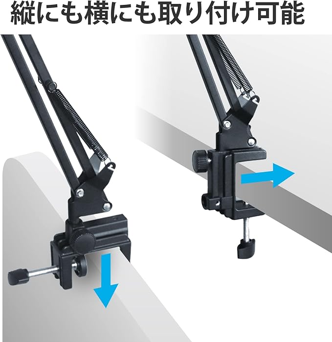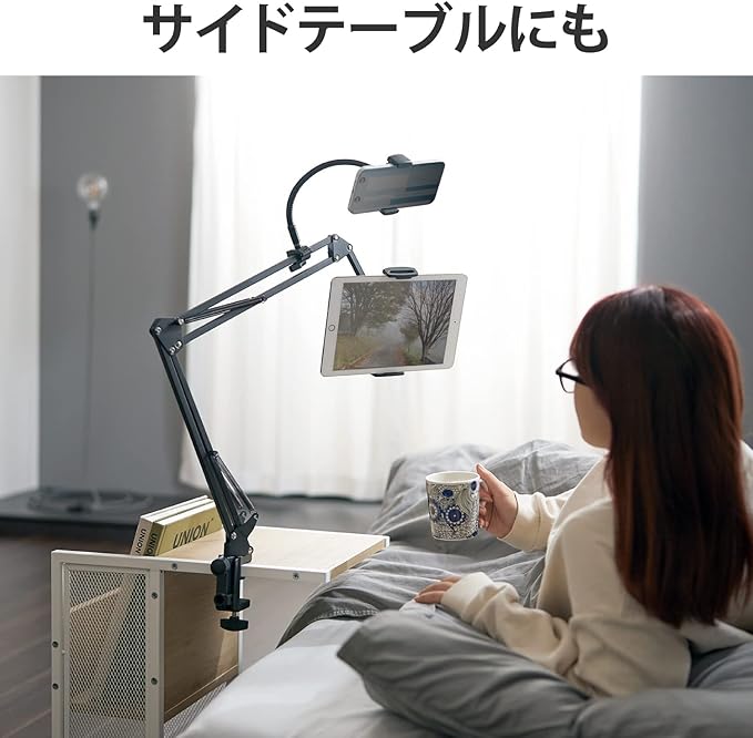 ■横方向に固定するとテーブルなどに取り付けて使用でき、縦方向に固定するとベッドのヘッドボードなどに取り付けられるので横になった状態でも使用できます。