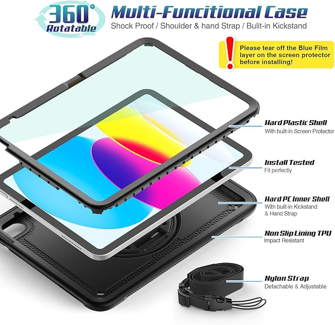 SEYMAC stock iPad A16 第11世代11インチ/第10世代10.9インチ専用ケース 耐衝撃 Gフック式ハンドストラップ 360 回転スタンド ペン収納 ショルダーストラップ フィルム付き前面フレーム 全面保護カバー (ブラック) | etshop