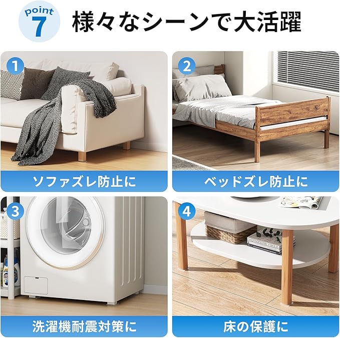 【特別設計で強力な滑り止め】 ソファー滑り止めシートは、家具用に特別に設計されています。角いデザインで、ソファーやベッドの脚にぴったりフィットし、安定した固定を提供します。床にスリップしないように保護し、騒音を効果的に軽減します。さらに、木製床面の傷つきを防ぎ、家の静かな環境を維持します。