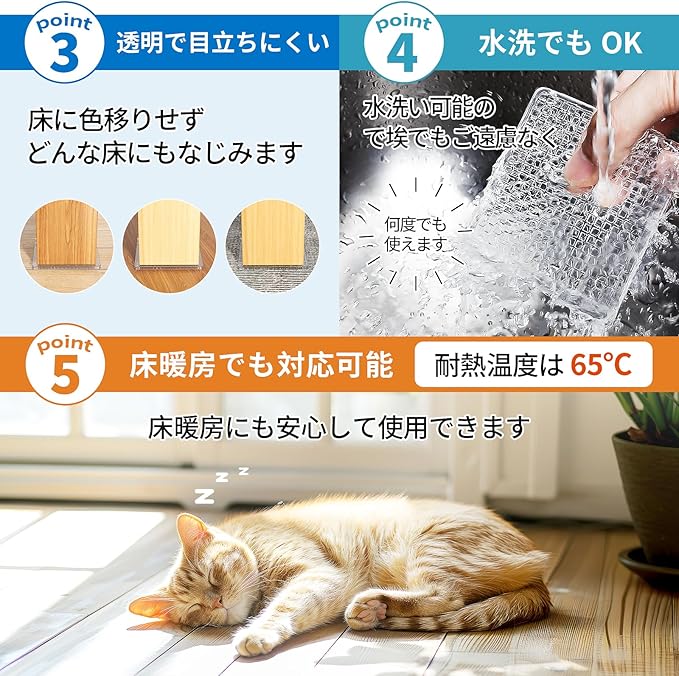 【適用範囲が広い】 クリアの滑り止めシートは、あらゆる家具や床と調和し、違和感なく使えます。様々な素材の床に適用でき、ソファーやベッドのみならず、椅子や机、金属の脚などにも使用できます。