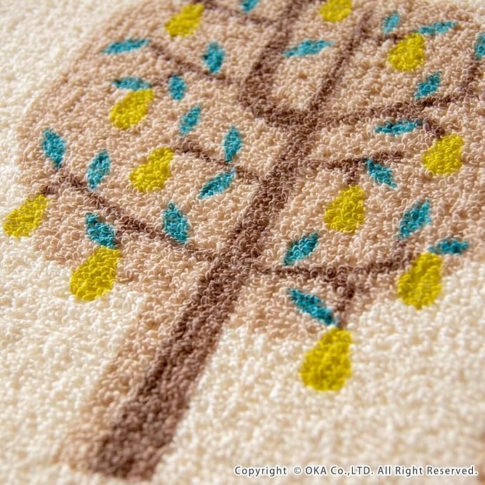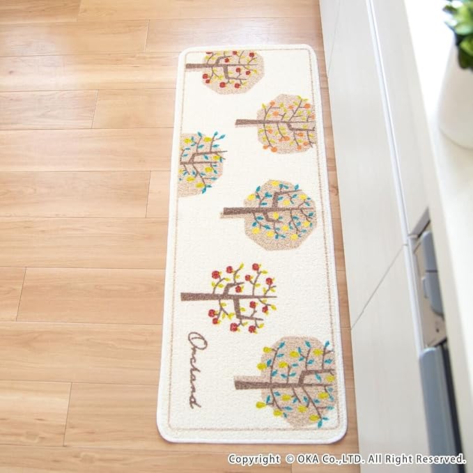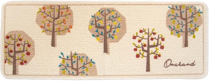 サイズ:約45cm 120cm | パターン(種類):オーチャード 顔料プリントキッチンマットにナチュラルテイストのキッチンマットが仲間入りしました。ナチュラルな木々が並んだかわいいデザイン。マットは、シャツなどを製造する時に出るハギレを再利用し、糸にした再生糸で出来た生地に柄をプリントしています。環境にも優しく、ナチュラルな風合いが特徴のマットに仕上がっています。 毛羽立ちが少なくお手入れも簡単です。裏面はすべり止め加工がされています。へたりにくいしっかりとした縫製、丸くカットした角はマットが浮き上がりにくいようになっており、足元がひっかかりにくく安心です。※床暖房の長時間の連続使用や高温でのご使用は避けてください