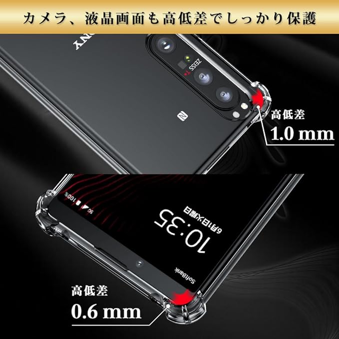 【カメラ、液晶画面は浮かせて保護】スマホを机などの平面に置いた場合に、液晶画面やカメラレンズが接触してできるキズが最小限に抑えられるよう、表側(液晶画面側)は0.6mmの、裏側(背面側)は1.0mmの高低差をつけ、浮かせることで傷や摩擦からガードします。