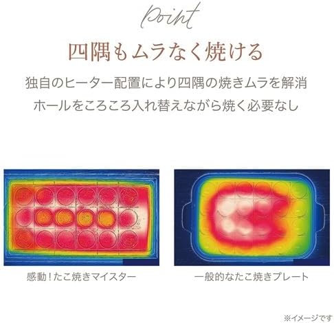 感動!たこ焼きマイスター スリム&ワイド設計で手前に取皿が置きやすく4人以上でも使いやすいスリム&ワイドな形状。左右で異なる種類を焼く時も「間仕切り壁」で混ざらない。焼きやすさと食べ応えの黄金比率「46mm」。まるで「壺の中で焼く」ようなイメージ。多方向から効果的に熱が伝わることで直径46mmの大玉にも関わらず「外はカリカリ」「中はトロトロ」を実現。フチまでガイドがあるから生地を敷き詰めてもガイドが探せてピックが入りやすい。