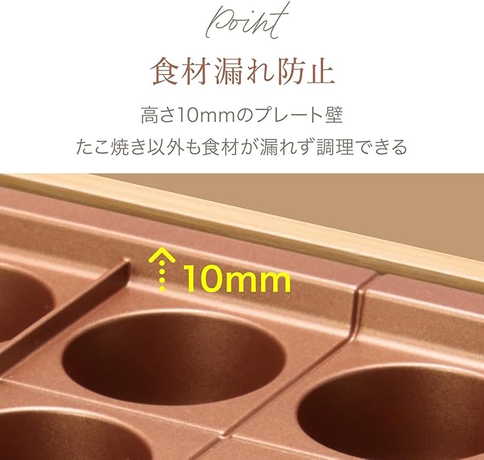 【こだわりポイント】1.ヒーター内蔵式 2.銅色チタンコート 3.裏面チタンコート 4.丸洗い可能 5.スリム&ワイド設計 6.間仕切壁 7.直径46mm大玉仕様 8.ホール深さ150%UP※当社従来品比 9.かど四つの焼きムラ解消 10.フチまでガイド 11.たこ焼き18穴 12.天然木台座 13.温度調節機能付 14.高いプレート壁 15.レーザー刻印