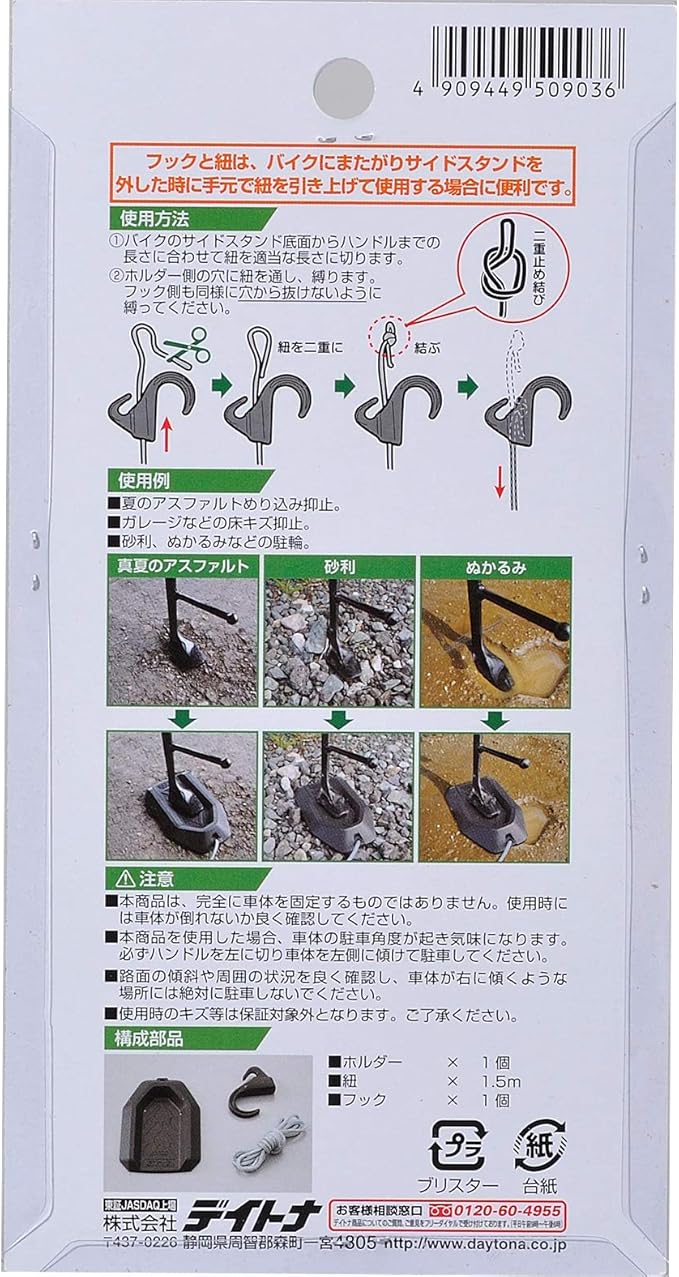 【用途1】不安定な砂地や草地などの駐車時、本品を置いてからスタンド掛けをすると安定して駐車できます【用途2】駐輪場やガレージなどで、サイドスタンドで床が傷付くことを防止します