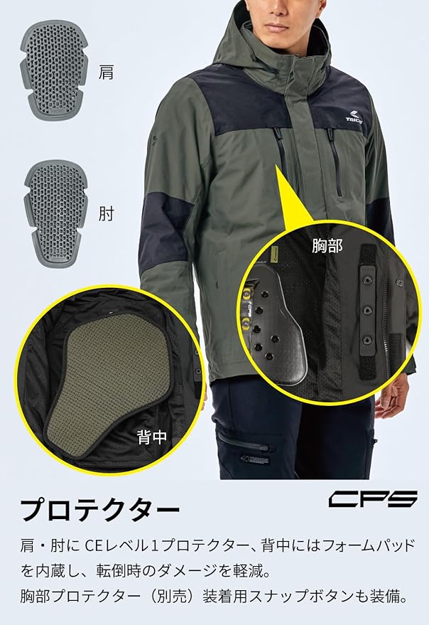 標準装備の肩・肘・背中の各プロテクターはCEレベル2プロテクター(別売)でアップグレード可能。