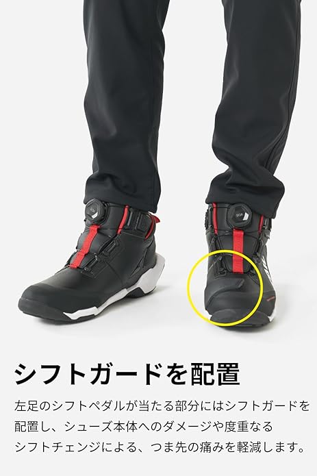 軽量ソールで歩きやすく、ライディング時には、外側に張り出したソールやシューズ内外に配置されたプロテクターが足への衝撃をやわらげます。