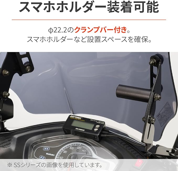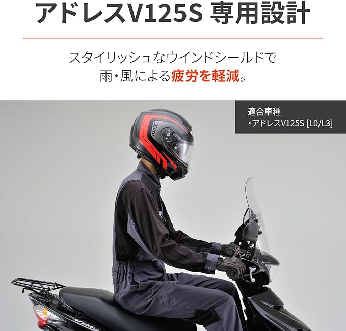 アドレスV125S (10-)[L0/L3]用シールド。空気抵抗による疲労軽減、雨や虫よけに効果があります。シールドは三次元立体成型によるスタイリッシュなデザイン。Φ22.2mmのクランプバーを同梱。スマートフォンホルダーなどのデジモノ装着が可能です。シールドは衝撃に強いポリカーボネイト製。傷や汚れに強いハードコーティング仕様だから、長期に渡ってクリアな視界を確保します。