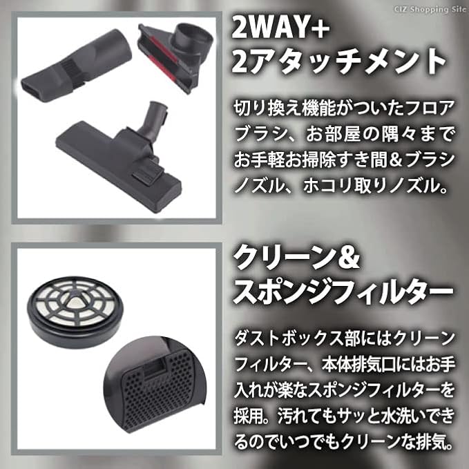 スタイリッシュなデザインで吸引力抜群のサイクロン掃除機です。 ダストカップを取り外してワンタッチでゴミ捨ても楽々。紙パックは不要です。 コンパクトで収納に場所をとりません。ダストボックス部にはクリーンフィルター本体排気口にはお手入れが楽なスポンジフィルターを採用。 汚れてもサッと水洗いできるのでいつでもクリーンな排気。 フローリング、じゅうたん、切り替えフロアーブラシ、すき間&ブラシノズル、ホコリ取りノズル等充実のアタッチメントであらゆるシーンで大活躍