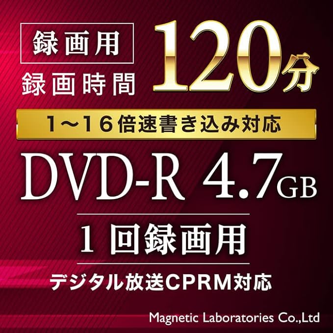 各ディスクは4.7GBのデータを保存でき、最大120分の録画時間を確保します。1-16倍速の書き込み速度に対応しており、効率的なデータ転送を実現します。