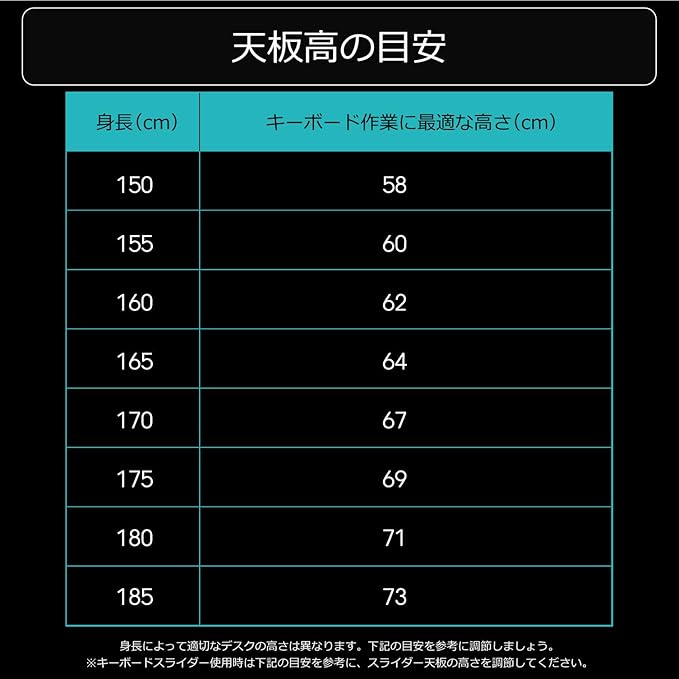 【身長に合わせて】身長に合わない高さのデスクで作業をしていると、姿勢が崩れて肩こりや腰痛の原因となることも。デスクを最適な高さに設定して、快適なゲーム環境を構築しましょう。