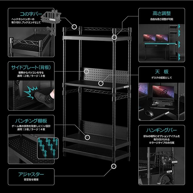 また、パンチング加工を施し、パソコン本体やゲーム機の排熱を阻害しにくい設計です。