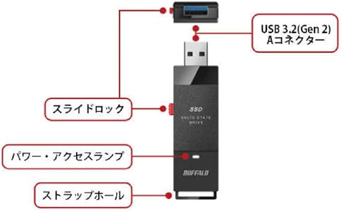 付属ソフト:DiskFormatter2、SecureLock Mobile2 寸法:幅 23 高さ 11 奥行 68.2mm 質量:約17g(ケーブル含まず)