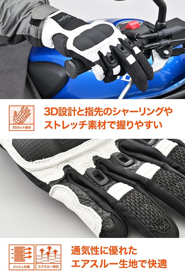 指に装備された通気孔が風を取り込み、真夏のライディンングを快適にします。