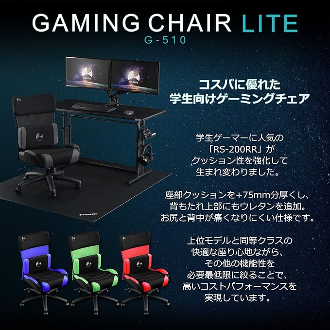 一般的な高性能ゲーミングチェアの約1/3程度の価格で、学生ゲーマーでも購入しやすい、コスパに優れたエントリーモデルです。
