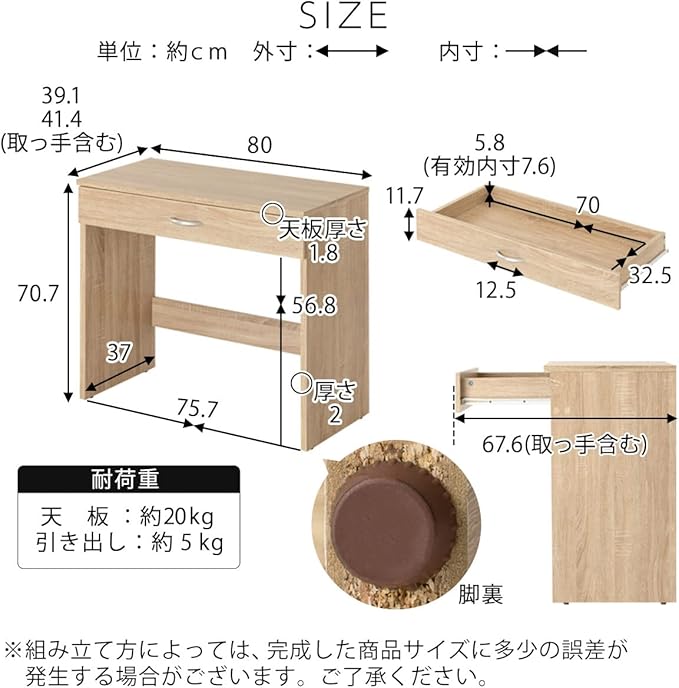耐荷重 天板:約20kg 引き出し:約5kg / 背面化粧:無し