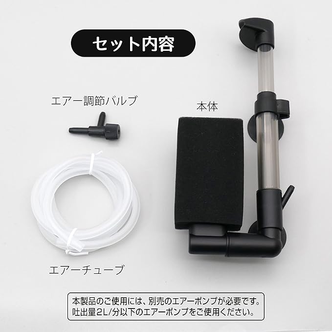 【本製品のご使用には、別売のエアーポンプが必要です。吐出量2L/分以下のエアーポンプをご使用ください】 1.ご使用前に本品を軽く水洗いする。 2.各パーツを組み立てる。 3.付属のエアーチューブをお好みの位置でカットし、エアー調節バルブの両端につなげ、エアーポンプ(別売)に繋げる。 4.フィルターを水槽にセットする。 5.底面フィルターとして使用する場合は、スポンジを外し必ずキャップをつけた状態でストレーナー部を底砂に埋めてご使用ください。