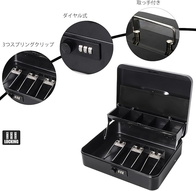 (トモリ)Tomori 手提げ金庫 コインケース 3つスプリングクリップ ダイヤル式 貯金箱 紙幣整理 金属製 (ブラック, L)