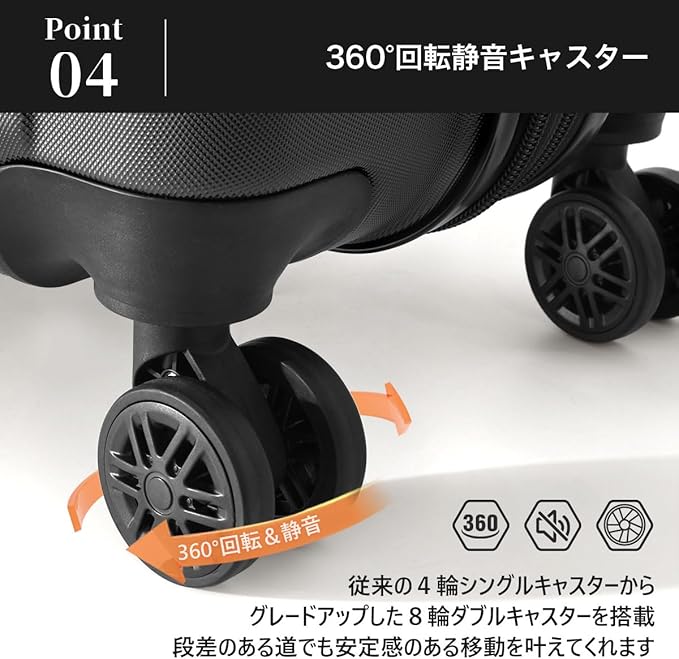 360 独立に回転できるダブルキャスターが搭載し、スムーズ、静音に動くことができます。まだ、硬質のコーナープロテクトが付く、本体保護を強化し、衝撃を防止し、使用寿命を延長できます。
