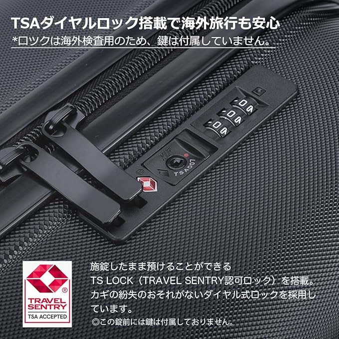 大切な荷物をしっかりと守るコーナーパッドと世界基準のTSAロック搭載。こちらのタイプのTSAロックはダイヤル式です。鍵穴がありますが、鍵は付属しません。鍵穴は空港職員用となります。
