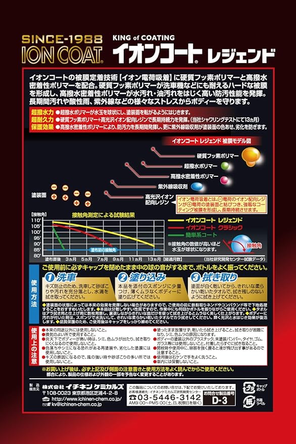 ●高撥水密着性ポリマーを新たに配合し、撥水性・防汚力アップ ●洗車機を20回連続使用しても塗布直後の状態の水玉コロコロをキープ ●当社耐久撥水テストによる耐久性も驚きの13 ヶ月持続