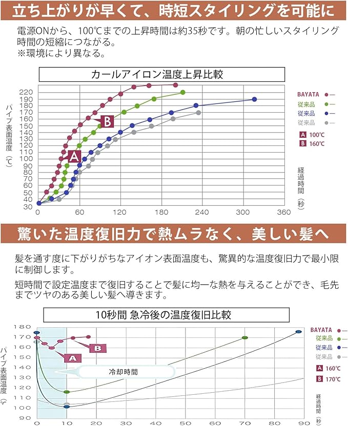 【急速な立ち上がり時間】このコテは電源を入れてから約35秒で使用可能な温度(100℃)に達します。全部髪質に対応する160℃まで75秒くらいがかかります。抜群な立ち上がり時間のかけで、忙しい朝も、キレイなカールを作られます。