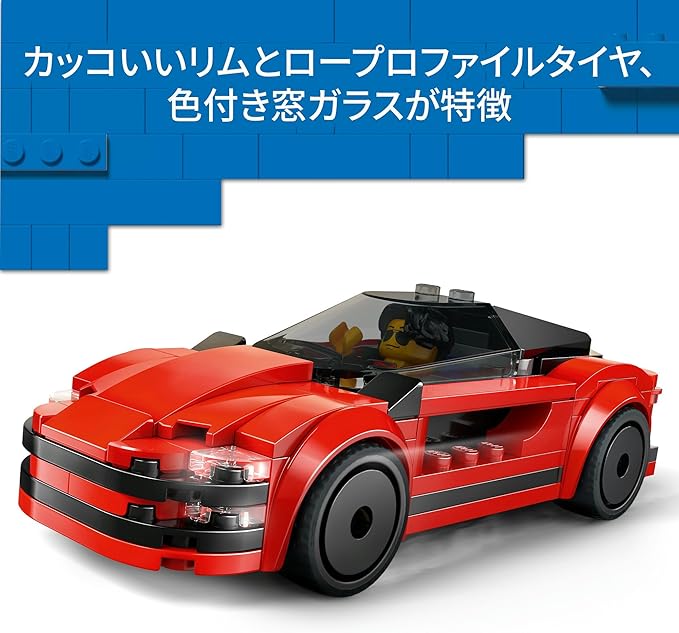レゴシティ 赤いスポーツカー(60448)は、5才以上のカーマニアが満面の笑顔になる組み立てセットです。カッコいいリムとロープロファイルタイヤ、色付き窓ガラスが特徴のスポーツタイプのオープンカーを組み立てます。完成したモデルにミニフィギュアを乗せ、トランクには携帯電話と洗車道具のパーツを収納できます。お子さまは赤いスポーツカーでハイウェーを飛ばし、想像の冒険に旅立ちます。 本セットには組み立て説明書が付属していますが、LEGO Builderアプリにも対応しています。アプリでは、立体表示されるモデルを拡大・回転し、あらゆる角度から確認しながら組み立てられます。 レゴ シティシリーズのセットは、リアルな建物やカッコいいのりものを組み立てて、親しみやすいキャラクターたちといっしょに限界突破の楽しさを味わえます。また、同じシリーズののりものセット(各セット別売)と組み合わせて遊びの舞台をさらに広げられます。