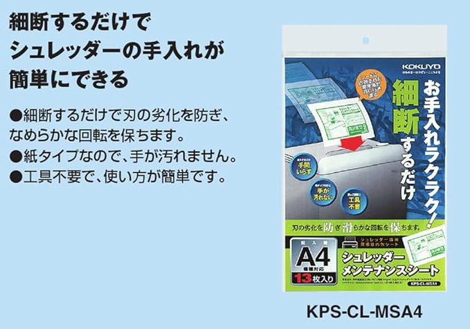 <B>製品概要:</B>細断するだけで、刃の劣化を防ぎ滑らかな回転を保ちます。紙タイプなので手が汚れません。工具不要で使い方が簡単です。