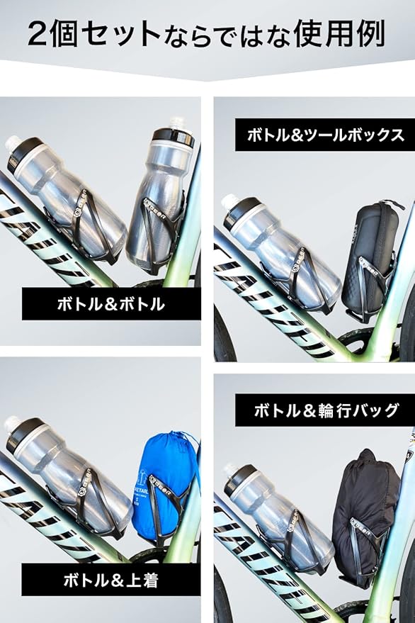 ✅【2個セットなのでアレンジ自由】ボトルケージには、サイクルボトルの他にツールボトルやペットボトル、水筒、ウィンドブレーカ、輪行バッグ等、様々なギアを装着可能。本ボトルホルダーは、ロードバイクやクロスバイクに最適で、2個セットなのでボトルの2本差しやボトルとツール缶等の組み合わせも可能です。