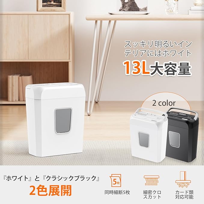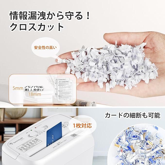 bonsaii 家庭用 シュレッダー 5枚同時細断 細密クロスカット5x18mm 連続細断4分 13L大容量 カード類対応 電動 ハンドルアップ式 コンパクト ホワイト C237-D白