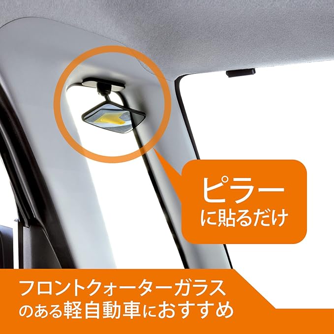 車両のAピラーに貼り付けることで、フロントタイヤ付近の死角を確認する事がでる補助ミラーです。運転席側、助手席側どちらにも取り付け可能です。フロントクォーターガラスのない車でも、隣斜線の車や歩行者/自転車を見るためや、車内を見るためのミラーとして使用できます。