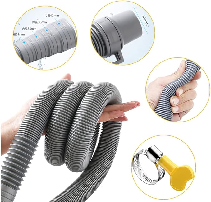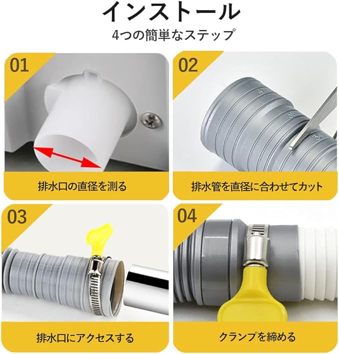 【取付簡単】洗濯機の詳細サイズに基づいて口をカットすることができます、ホースの継ぎ目を洗濯機の排水口に接続します、ホースクランプ或いは粘着テープで洗濯機の排水口と排水ホースがしっかり接続して水漏れないです。