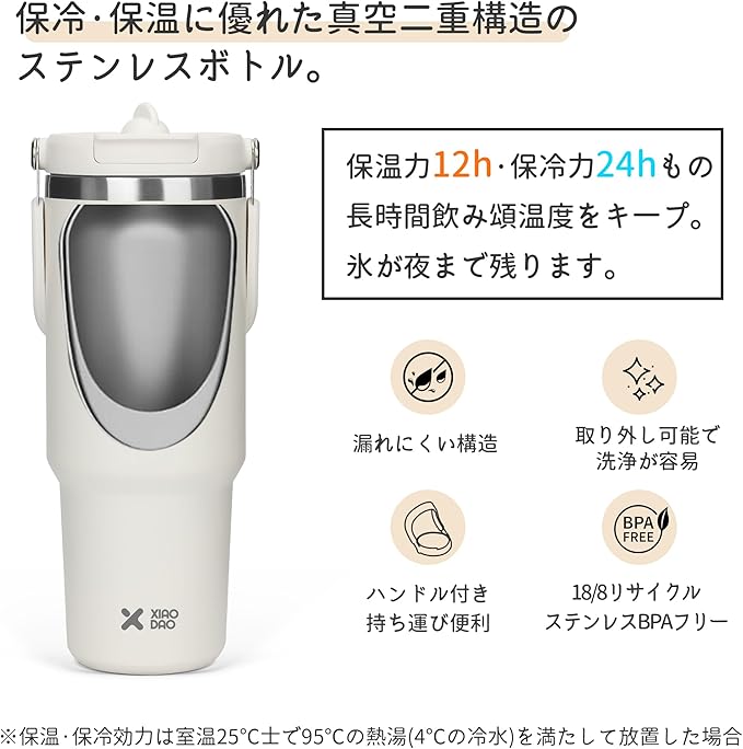 SKIASE タンブラー ストロー付き 900ml 水筒 大容量 ウォーターボトル 真空断熱 保温 保冷 ステンレスボトル 広口 直飲み 蓋付き アウトドア 取っ手付き 持ち運び こぼれない ホワイト | etshop