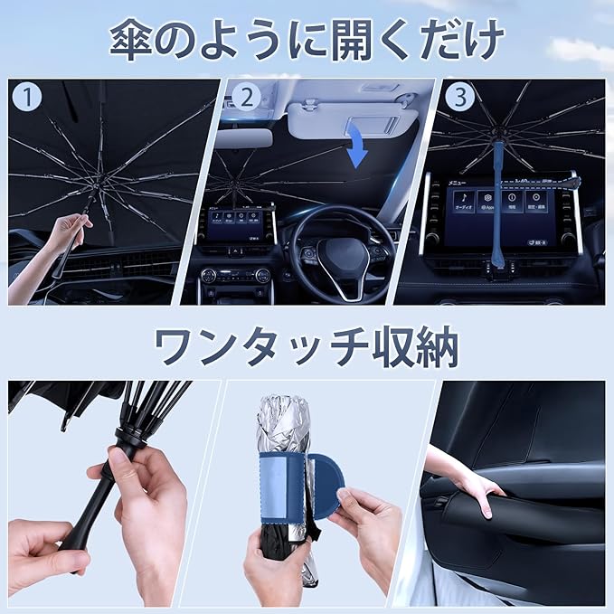 3.【UVカット・断熱・内装劣化防止】新登場傘型サンシェードは、99%以上の紫外線を効果的に遮断できるチタンシルバーコーティングが施されて、素晴らしい遮光性と断熱性を備えています。車内の温度有効にを下げるだけでなく、日光による室内装飾の劣化を防ぎ、使用寿命を延びます。高温な直射日光で有害なガスの排出を防げます。